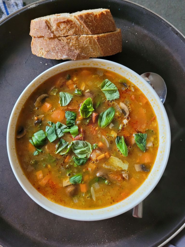 This soup is best enjoyed with some crusty bread & a glass of Chianti….or failing that, a brew will do.